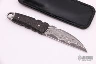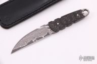 This knife by Apeiron Bladeworks features a "PM Suminagashi" San Mai Damascus blade with notched thumbrest .097" blade stock and .678" blade depth, full tang construction. The handle has carbon fiber scales and a lanyard hole at the butt. Comes with a black leather sheath and COA dated September 2018. Excellent condition.