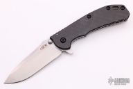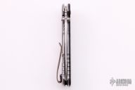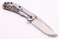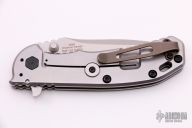 This 0566 Hinder Design Flipper by Zero Tolerance features a tumble finished drop point blade with swedge, dual thumb studs, notched thumb rest and flipper. The handle is comprised of a black G10 scale over a titanium liner and a tumbled titanium lockside over black barrel spacers. The black coated steel tip up clip is reversible for right or left hand carry. Lanyard hole in pommel. Comes with a zippered case. Excellent condition.