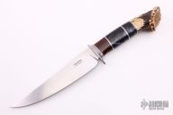 This knife by Rodney Rogers features a hand rub satin finished blade with .190" blade stock and 1.425" blade depth, hidden tang construction. The handle has a stainless steel guard, crown stag butt, black pearlex and cocobolo grip with black and aluminum spacers. Excellent condition.