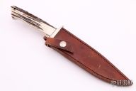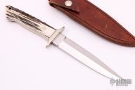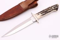 This Fighter by WC Davis features a mirror finished clip point blade with sharpened top edge, .182" blade thickness and 1.158" blade depth, full tapered tang. The handle has a nickel silver guard, stag scales and red liners. Excellent fit and finish. Comes with brown leather sheath and zippered case. Excellent condition.