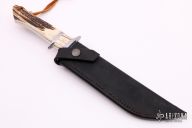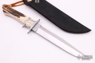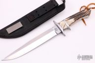This Sub-Hilt fighter by Mike Sanders features a mirror polished blade with false top edge, .250" blade stock and 1.186" blade depth, full tapered tang construction. The handle has a stainless steel guard and sub-hilt, stag scales and nickel silver pins. Comes with a black leather sheath and a zippered case. Has some light scratches, otherwise excellent condition.