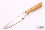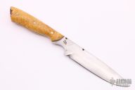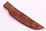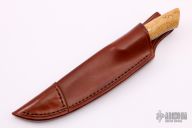 This knife by Cattle Dog Forge features a hand rub satin finished blade with notched thumbrest, .180" blade stock and 1.025" blade depth, full tapered tang construction. The handle has black ash burl scales with brass pins. Comes with a left-handed brown leather sheath. Excellent condition. Still has some visible forging marks.