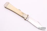 Parker Company revived many vintage designs with a modern look and this one is fashioned after the Civil War era "Coffin" shaped handle. This knife is BIG, 10.75 inches in overall length with a 4.75 inch blade. Emblazoned "Ourselves we must defend" Blade is Japanese made surgical steel, handle is thick bone with brass liners and nickle silver bolsters. Serial #253. Excellent condition. Comes with original box.