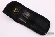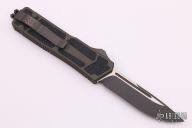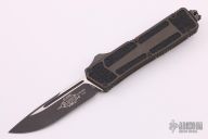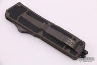 This QD Scarab OTF auto by Microtech Knives has a two-tone blade with a black finish, satin flats and plain edge. The handle is OD Green aluminum with non slip inserts, a tip down black stainless steel clip and a single glass breaker. Dated 06/2003, serial number 1408. Comes with  original box, sheath and papers. Excellent condition.