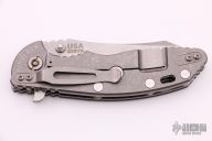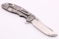 This XM-18 Skinner from Rick Hinderer Knives features a 3.5" stonewashed blade, notched thumbrest and flipper, dual thumbstuds. The handle has a black/blue G-10 scale, and stonewashed titanium handle, tip up or down pocket clip, fuller tab and standoffs. Clip can be mounted for tip up or down carry. Nice lockup, seating, and detent. Excellent condition. Comes with original box.