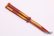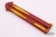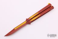 This Tachyon III balisong by Marfione Custom Knives has a red/yellow clip point blade with sharpened top edge. The handles are red titanium with spring latch and yellow tip up pocket clip, red hardware. Includes original box and papers. Rides on bearings, no blade play, very smooth. S/N 0038. Excellent condition.