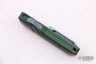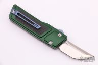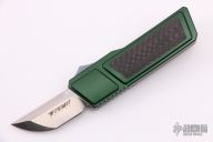This Akuma OTF Auto by No Limit Knives features a satin finished tanto blade. The handle has a green aluminum frame with carbon fiber inlays, tip up anodized titanium clip. Comes with a zippered case. New from maker.