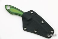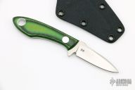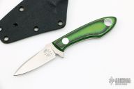 This custom fixed blade by Tom Krein features a satin finish blade and tang. Green linen micarta/carbon fiber scales. Full tang construction with .108" blade stock and .695" blade depth. Includes a black kydex neck sheath. Excellent condition. Dated 2006