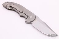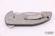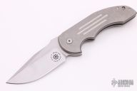 This Crossfire Mid-Tech from David Mosier has a Clip Point CPM 154 blade with stone washed finish. Thumb ramp with jimping provides excellent purchase. The sculpted titanium frame has a fuller pattern milled on the non lock side. Open frame design and titanium standoffs make for very lightweight carry EDC knife. Knife has a tip up, right hand carry titanium pocket clip. Great blade centering, crisp detent and nice lock up with zero blade play. Excellent Condition.