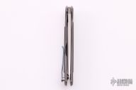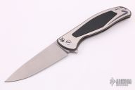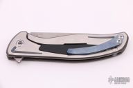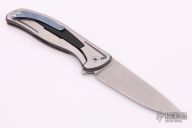 This Nude Model 95 by Shirogorov Knives features a tumble finished drop point blade with flipper. The handle is comprised of a tumble finished titanium frame, carbon fiber inlays and a single titanium barrel spacer. Anodized titanium tip up clip. Lanyard hole in pommel of "A" side scale.  Includes a padded zippered case.  Has a few light scratches, otherwise excellent Condition.