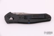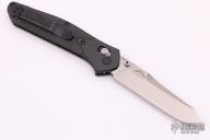 This Benchmade Osborne 940 features a tumble finished clip point blade with swedge and dual thumb studs. The handle is comprised of a machined carbon fiber frame and a black coated, steel tip up clip is reversible for right or left hand carry. Comes with original box and papers. Excellent condition.