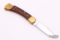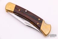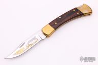 This Model 110 by Buck features a laser engraved blade with nail nick. The handle has a brass frame with wood scales. Comes with original box, black leather sheath and papers. #95 of 100 on blade. Comes with a Buck knives belt buckle as well. Excellent condition.