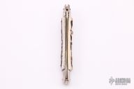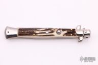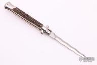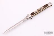 This Swivel Bolster from Stiletto Italy features a Kris ground blade with false top edge. The handle consists of stainless steel bolsters and pommel with stag scales over brass liners and stainless steel backspacer. Has some light scratches, otherwise excellent condition.