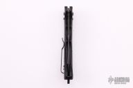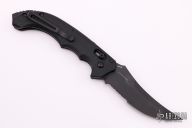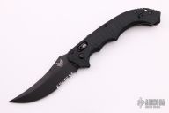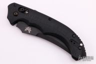 Well-balanced, symmetrical, eye-catching, The Bedlam has a black coated 154CM partially serrated blade that is released with the AXIS locking button.  Safety on top of knife. Sculpted black G10 handle fits comfortably and securely. Reversible tip up black clip. Excellent condition. Includes original box and papers.