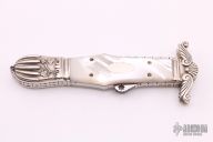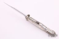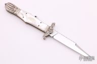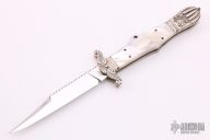 This Lockback folder by Larry Brandstretter features a mirror polished blade with fileworked spine and a nail nick. The handle has carved/engraved nickel silver bolsters, mother-of-pearl scales with nickel silver escutcheon, fileworked nickel silver liners and a fileworked stainless steel backspacer. Nice lockup and blade seating. Has a few light scratches, otherwise excellent condition. #005. Made in Sheffield England.