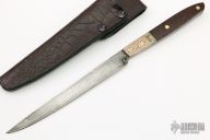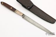 This knife by Shane Stainton features a coal-fired forged blade with a full tang construction.  .169" Blade Depth.  0.704" Blade Depth.  The handle features mokume bolsters, cocobolo scales and brass pins.  Includes a brown leather sheath and a padded zippered case.  Excellent Conditions.
