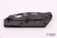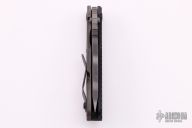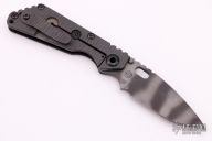 This SNG by Strider Knives features a tiger striped tanto blade with notched thumbrest and thumbhole. The handle has a Frag pattern black aluminum and flamed titanium frame with matching tip up clip. Nice detent, lockup and blade seating. New condition.