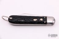 This antique auto by Presto features a clip point blade with naked ladies. The handle has steel bolsters, jigged scales, steel liners and backspacer, has safety. Nice action, blade seating and lockup. Has some scratches, otherwise good condition.