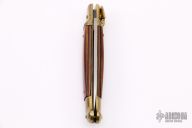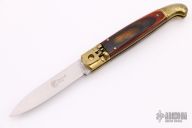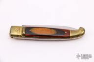 This leverlock auto features a satin finished blade. The handle has brass bolsters and butt, laminated wood scales and brass liners. Strong opening. Has a few light scratches, otherwise good condition.