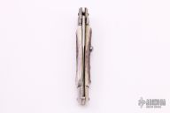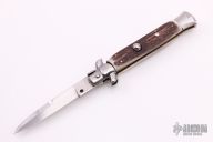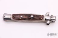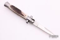 This swivel bolster auto by C Jul Herbertz features a satin polished blade. The handle has stainless steel bolsters and butt, stag scales and brass liners. Strong opening. Has safety. Has a few light scratches, otherwise excellent condition.