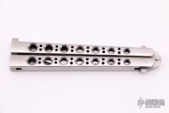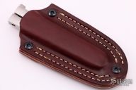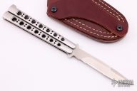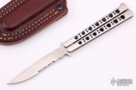 The model 45s by Benchmade features a spear point partially serrated blade with false top edge. Stainless steel skeletonized handles with T latch. Has a few light scratches, otherwise excellent condition. Comes with a custom brown leather sheath.