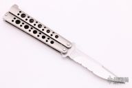 This is a Model 30 Bali-Song with a partially serrated blade and swedge. The handles are stainless steel with a T-latch. Has a couple of light scratches, otherwise the knife is in excellent condition. Comes with original sheath. "Harley-Davidson" on the blade.