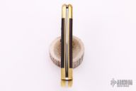 "This old classic BUCK knife 110 "Folding Hunter" was first introduced in 1965 - it has been BUCKS mainstay ever since. Some say the Buck 110 is the most copied knife in the world. This Buck automatic knife has a beautiful dymondwood scales with brass bolsters and a plate that opens knife automatically. A must for any BUCK collection." Has some scratches, otherwise good condition.