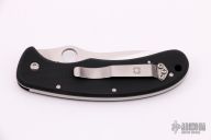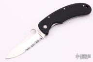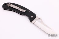 The Tim Wegner C48S by Spyderco is a very collectable Spyderco knife that has been discontinued and is designed to be a hunter with its large hunter trailing point blade. Tim Wegner ended up producing this knife with Blade Tech. Partially serrated and satin finished blade, ATS34. Textured black G10 handle. Stainless tip up carry clip and liner. Has a nice detent, lockup and blade seating. Includes the original box and papers.  Excellent Condition.