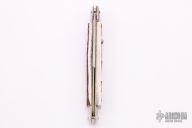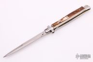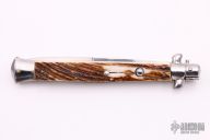 This swivel bolster auto features a polished blade with a false top edge. The handle has stainless steel bolsters and butt, stag scales and brass liners. Strong opening. Has safety. Has some light scratches, otherwise excellent condition.