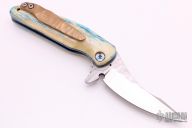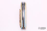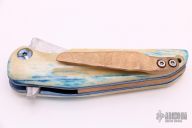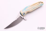 The Ahriman by Apeiron Bladeworks features a satin finished blade with carved flats and notched flipper. The handle has fluted giraffe bone scales, anodized titanium liners, bronze backspacer and tip up clip. Nice detent and blade seating, doesn't lockup well, caged ceramic bearings & detent. Comes with a zippered case. Excellent condition.