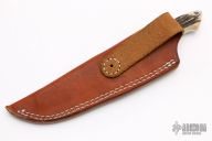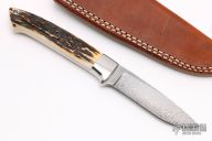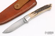 This drop point hunter by Gordon Romeis features a Damascus blade with .149" blade stock and .859" blade depth, full tapered tang construction. The handle has stainless steel bolsters and stag scales. Includes a brown leather sheath.  Excellent condition.