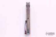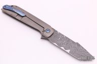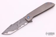 This XL Tanto flipper from Simeon Custom Knives features an Armor Core San Mai Damascus multi-ground blade with flipper. The titanium scales are tumble finished with anodized titanium hardware and pivot collars, tip up MokuTi clip. This knife flips very well and locks up with absolutely no play. Blade is centered when closed. Very nice fit/finish. Comes with a padded case. Rides on bearings, nice detent, lockup and blade seating. Excellent condition.