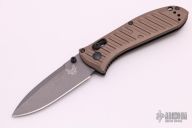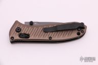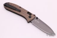 This SHOT Show exclusive manual Mini Presidio II model sports a burnt bronze aluminum handle and a gray finished blade made from CPM-M4 steel. Benchmade has updated their legendary Presidio model with a smaller build and performance upgrades. This combat legend has a black anodized 6061-T4 billet aluminum handle with Benchmade's AXIS lock system for effortless one-handed opening and closing. Milled grooves in the handle improve grip while adding a modern flair to the design. The Presidio II has a slightly larger blade and handle that is built to perform well as a tactical or everyday carry knife. 6061-T6 billet aluminum handle offers a tough build without weighing you down. Dual thumb studs, reversible pocket clip, and an AXIS® lock mechanism provide a fully ambidextrous design. Blade is made from CPM-M4 steel for maximized strength and cutting performance. Comes with original box and papers. Excellent condition. Limited edition #0920/1000