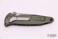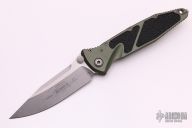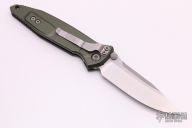 This Socom Elite manual linerlock folder from Microtech has a stonewashed blade with a standard edge, and a green aluminum handle with nonslip inlays. Serial number 6449 and dated 10/2019. Includes the original box and papers.