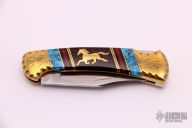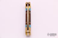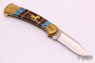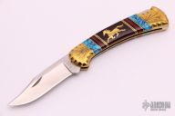 This Buck Model 112 knife Customized by David Yellowhorse is a lock back with brass bolsters, ironwood, turquoise, jasper and brass spacers. Satin finished blade. Strong lock up. Includes a padded zippered case. Excellent condition.