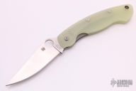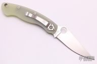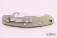 This Military by Spyderco has a satin finished blade with notched thumb rest and thumb hole. Handle is jade G-10, with stainless steel single liner (lock), standoffs, stainless steel tip down clip, and lanyard tube pin. Excellent condition. Comes with original box and papers.
