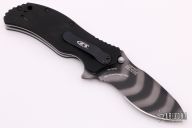 This 0350TSST liner lock flipper is a Ken Onion design executed by Zero Tolerance and features a recurved spear-point blade with a tiger stripe finish, stainless steel liners and black G10 scales. It also features the Speed-safe assisted opening system. The black coated steel clip is 4 way adjustable. Excellent condition. #12716