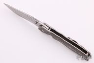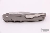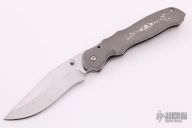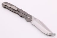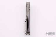 This Sirocco framelock folder by Matt Cucchiara features a satin finished blade with single thumbstud. The handle has a bark finished titanium frame with drilled pattern and a tip up titanium clip with hidden screws. Nice lockup and blade seating. Very smooth. Has a scuff on the clip, the very tip is blunted, otherwise excellent condition.
