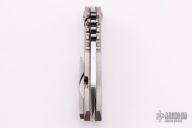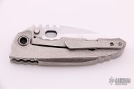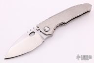 This Vega frame lockfolder by Dalibor Bergam features a satin finished blade with hollow grind, dual thumbstuds, thumb hole, and notched thumbrest. The handle is bark finished integral titanium with matching tip up clip. Nice detent, blade seating and lock up. Comes with a zippered case and COA dated August 25 2015. Excellent condition.