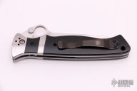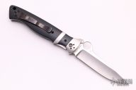 This Vallotton Sub-Hilt Auto by Spyderco was converted by Butch Vallotton, it features a satin finished S30V blade with a thumb-hole, dual thumb-studs, and notched thumb-rest. The handle has stainless steel bolsters, black G-10 scales, stainless steel liners, black G-10 backspacer, and 4-way reversible black stainless steel clip. Nice detent, lockup and blade seating. New from the Vallotton Shop! Comes with original box and papers. Can be opened manually or as an auto.