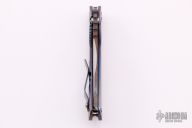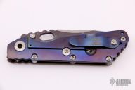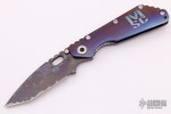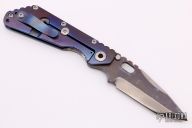 This Mick Strider custom SMF framelock folder has been ground by Jeremy Horton, it features a chisel ground tanto Strike Plate Titanium blade with notched thumbrest and thumbhole. The handle has a anodized and orange peel finished titanium frame with laser etching and a matching clip. Includes Hinderer "Lock Bar Stabilizer" for maximum reverse lock retention. Nice lockup, blade seating and detent. Comes with a velcro case, excellent condition.