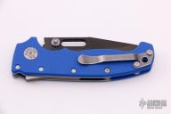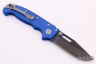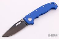 This AD20 by Andrew Demko features a DLC finished 20CV blade with notched thumbrest, thumbhole and dual thumbstuds. The handle has a Blue G-10 frame with a tip up stainless steel clip and "Shark" lock release on the spine. New from Maker!