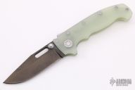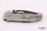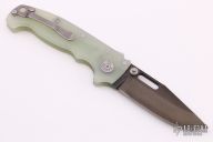 This AD20 by Andrew Demko features a DLC finished 3V blade with notched thumbrest, thumbhole and dual thumbstuds. The handle has a Natural G-10 frame with a tip up stainless steel clip and "Shark" lock release on the spine.  New from Maker!