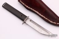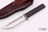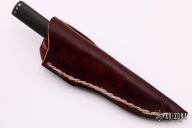 This knife by Spencer Murray features a hand rub satin finished blade with fullers, .161" blade stock and .850" blade depth, hidden tang construction. The handle has a stainless steel guard, carbon fiber grip with copper spacer and pin. Has some scratches otherwise good condition. Comes with a brown leather sheath.