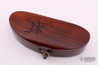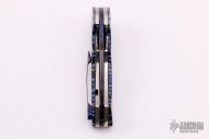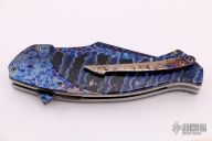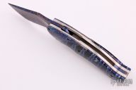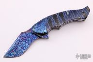This knife features a Dragon Skin Damascus recurved blade, bolsters and pocket clip.  The handle features dyed blue mammoth molars over polished titanium liners.  Nice detent, lockup and blade seating.  Includes original wood display case.  Excellent Condition.