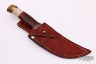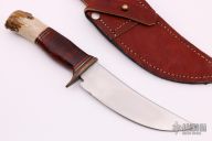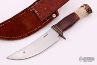 This Scagel Style Hunter by Ray Busch Jr features a hand rub satin finished blade with .140" blade stock and 1.400" blade depth, hidden tang construction. The handle has a brass guard, stag and stacked leather grip with red/black/brass spacers. Comes with a brown leather sheath. Has some scratches and a couple stains on the blade, otherwise good condition.