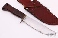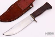 This Camp Knife by Ray Busch Jr features a hand rub satin finished blade with .135" blade stock and 1.670" blade depth, hidden tang construction. The handle has a brass guard, wood and stacked leather grip with red/black/brass spacers. Comes with a brown leather sheath. Has some scratches, dings in the edge and a couple stains on the blade, otherwise fair condition.