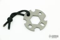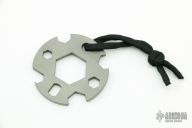 "Made of titanium, this pocket disc tool is loosely based on an antique lantern wrench design from the 1940s. Features include 1/4 and 5/16 hex openings, 3/8, 7/16, 1/2 inch wrenches, O2 cylinder wrench and 5/16 open end wrench/bottle opener." Bead Blasted 6AL4V titanium. Excellent condition. Comes with original bag and card.