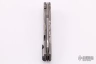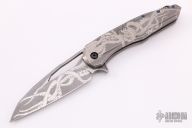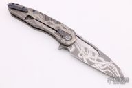 This Sigil MK3 by Deryk Munroe features a tumble finished blade with thumb hole, flipper, and notched thumbrest. The handle has a tumbled titanium frame with blue titanium hardware and a tumbled and anodized titanium backspacer. Beautiful laser engraving spanning the frame and blade, which includes a black pivot screw, tip up titanium clip, and "force textured titanium" overtravel stop. Nice detent, lockup and blade seating. Rides on bearings. Comes with original box, cards, and Band-Aid. New condition and Rare as hen's teeth.