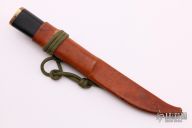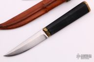 This Tapio Wirkkala Design Pukko by Hackman Finland features a satin finished blade with .145" blade stock and .925" blade depth, hidden tang construction. The handle has brass bolster and butt cap and a black composite handle. Comes with a brown leather sheath. Has some light scratches, otherwise excellent condition.